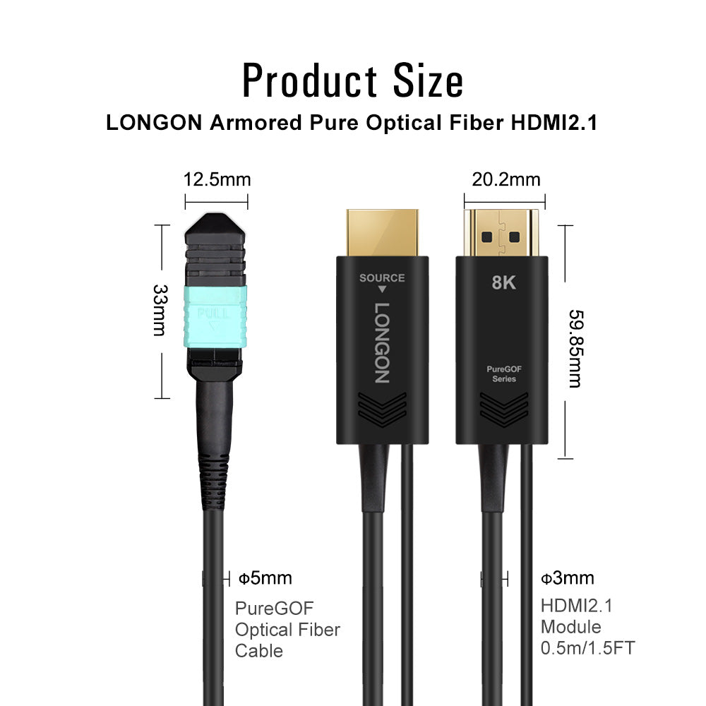 · LONGON Armored Pure Optical Fiber Cable HDMI2.1 Cable is unique Active Optical Fiber Cable in the market with only optical fiber inside.It adopts advanced Texas Instruments chip and strong armored optical fiber cable. Slim/Portable/Long distance, cable OD only 4.0mm, max length is 333m.